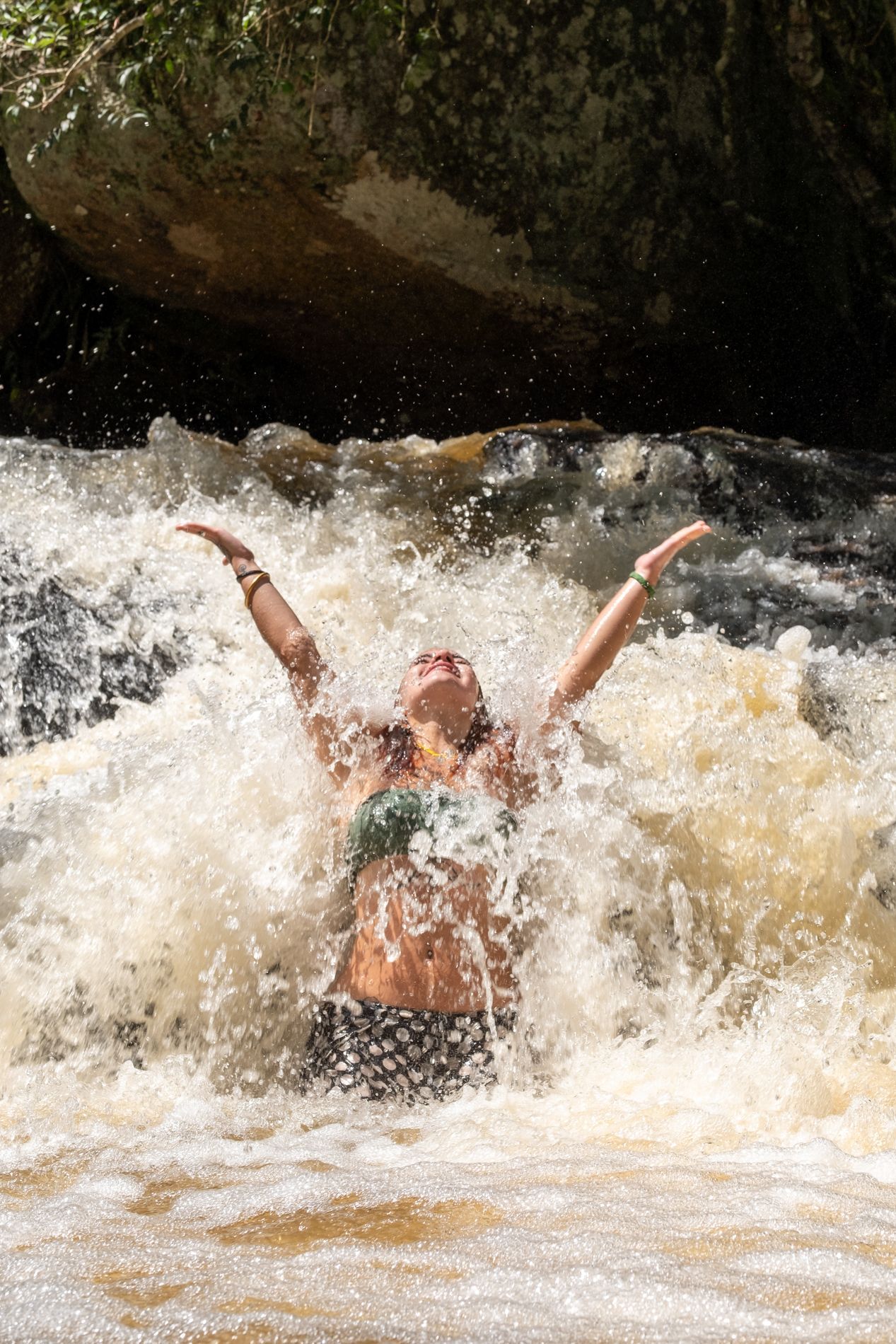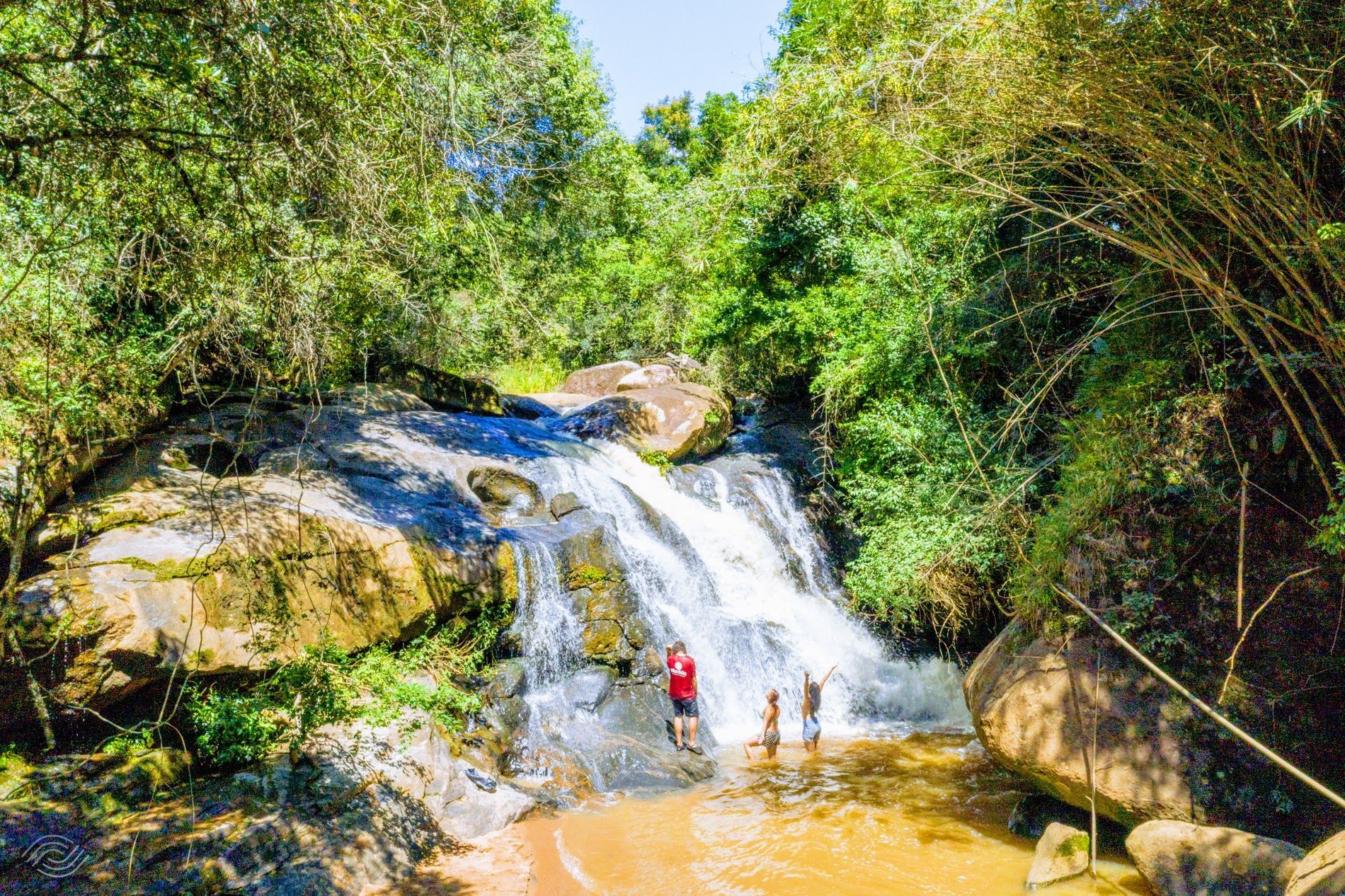 Trilha das cachoeiras, pôr do sol, fogueira e balanço gigante com vista para as montanhas.